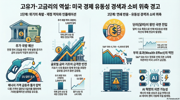 중동 전쟁 장기화로 인한 재정 적자 확대와 고물가가 글로벌 금리 상승을 유발하고 있습니다. 이 과정에서 발생하는 '현금(달러) 선호' 현상이 비유동성 자산의 매각과 미국의 자본 소득 기반 소비 구조를 위협하고 있으며, 에너지 비용 상승이 AI 혁명의 속도까지 늦출 수 있는 구조적 위험을 분석합니다.
