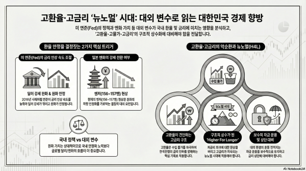 - 금리와 환율의 동행 (H4L): 환율이 과거의 낮은 레벨로 돌아가지 못하는 '뉴노멀'에 진입했다면, 금리 역시 과거의 저금리로 복귀하기 어렵습니다. 고환율은 수입 물가를 자극하여 한국은행의 금리 인하를 방해하는 핵심 기제로 작용합니다.