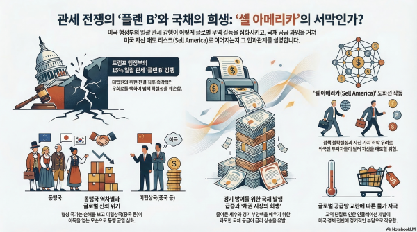 미국 연방대법원의 트럼프 행정부 '상호 관세 무효 판결'과 이에 맞대응하는 미국의 플랜B(15% 일괄 관세 강행)가 촉발한 글로벌 무역 갈등의 심화, 그리고 이로 인해 연쇄적으로 발생하는 주요국의 재정 적자 확대와 잠재적인 '셀 아메리카(Sell America)' 리스크를 경고하는 내용입니다.