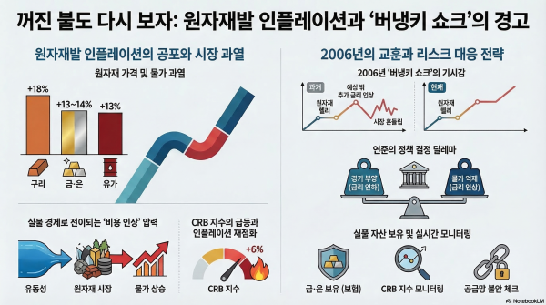 • 잊힌 인플레이션의 역습: CPI(소비자물가) 수치가 목표치인 2% 인근에 머물며 안정된 듯 보이지만, 원자재 가격 상승에 따른 공급 측면의 물가 압력은 언제든 '꺼진 불'을 다시 살릴 수 있는 폭발력을 지니고 있습니다.
