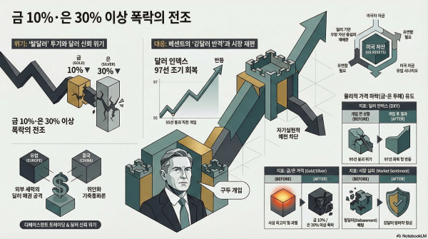 - 자기실현적 예언의 차단: 환율은 심리에 민감합니다. '달러가 무너진다'는 인식이 퍼지면 멀쩡한 통화도 흔들릴 수 있습니다. 베센트의 등판은 이러한 심리적 쏠림을 물리적 가격 하락(금·은 투매)으로 돌려놓으며 달러의 위상을 재확인시킨 사건입니다.