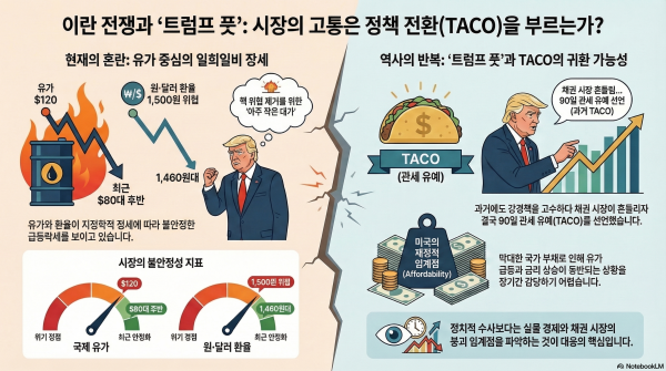 이란 전쟁의 종전 기대감과 장기화 우려가 교차하며 글로벌 금융 시장(유가, 환율, 증시)이 극단적인 일희일비 장세를 보이고 있습니다. 트럼프 행정부는 현재의 고유가와 시장 혼란을 '평화를 위한 일시적 대가'로 치부하며 강경한 태도를 유지하고 있으나, 본 요약은 1년 전 관세 정국 당시의 데자뷔를 통해 시장의 고통이 임계점을 넘을 경우 정책적 후퇴(TACO) '트럼프 풋'이 재현될 가능성을 분석합니다.