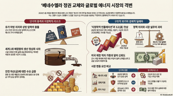 2026 1, 트럼프 행정부의 전격적인 베네수엘라 군사 작전과 마두로 대통령 체포는 글로벌 에너지 시장에 거대한 충격을 주었습니다. 이는 트럼프의 'Drill Baby Drill' 정책과 맞물려 장기적인 저유가 기대감을 형성하고 있으나, 단기적으로는 지정학적 불안 확산에 따른 공급망 병목과 금·유가 등 안전 자산 및 에너지 가격의 하방 지지 요인으로 작용하고 있습니다.