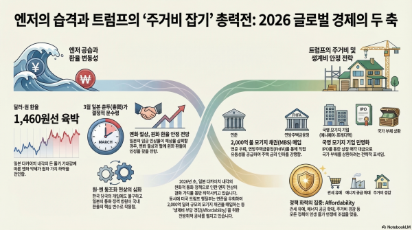 2026년 초, 달러-원 환율이 1,460원선에 육박하며 불안정한 흐름을 보이는 가운데, 그 이면에는 일본 '다카이치 내각'의 돈 풀기 기대감에 따른 엔화 약세(원·엔 동조화)가 자리 잡고 있습니다. 한편, 미국 트럼프 행정부는 중간선거를 앞두고 '감당 가능성(Affordability)'을 확보하기 위해 연준을 우회하여 2,000억 달러 규모의 모기지 채권(MBS) 매입이라는 파격적인 카드를 꺼내 들었습니다.