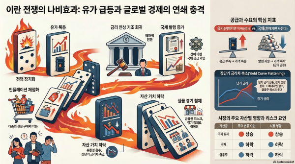 초기 단기전으로 예상되었던 이란 사태가 2022년 러시아-우크라이나 전쟁처럼 장기화될 조짐을 보이면서 금융 시장의 불안감이 고조되고 있습니다. 전쟁 장기화는 필연적으로 국제 유가 급등을 촉발하며, 이는 인플레이션을 재점화하여 미국 연준(Fed)과 유럽중앙은행(ECB)의 금리 인하 기대를 꺾고 있습니다. 물가 상승, 통화 정책의 매파적 전환, 그리고 전비 지출에 따른 재정 적자 확대가 맞물리면서 채권 시장과 자산 시장 전반에 강력한 연쇄 충격이 가해질 위험이 커지고 있습니다.