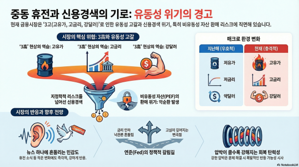 중동 사태의 휴전 가능성 언급에 따른 시장의 민감한 반응을 통해 현재 금융시장을 압박하는 근본적 원인이 '유동성 부족'과 '신용경색'에 있음을 분석합니다. 고유가, 고금리, 강달러라는 악재가 겹치며 사모펀드 등 비유동성 자산에서 시작된 위기가 시장 전반으로 확산될 수 있는 위험성을 경고하고 있습니다.