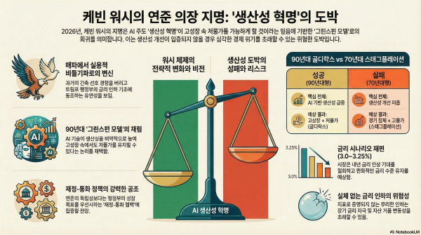 • 생산성 혁명의 실체 입증 과제: 워시의 정책이 성공하려면 AI가 가져오는 생산성 향상이 지표로 증명되어야 합니다. 생산성 개선 없는 금리 인하는 90년대 골디락스가 아닌, 70년대 식 스태그플레이션을 초래할 수 있는 위험한 도박입니다.
