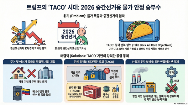 코스피 5,000선 시대를 앞둔 국내 증시의 호조세와 대조적으로, 미국 내부에서는 주거비와 생필품 가격 폭등으로 인한 민생고가 심화되고 있습니다. 이에 트럼프 행정부는 기존의 '규제 완화'와 '보편적 관세' 기조를 꺾고, 물가 안정을 위해 정책 방향을 트는 소위 '타코(TACO, 정책 번복)' 행보를 가속화하고 있습니다.