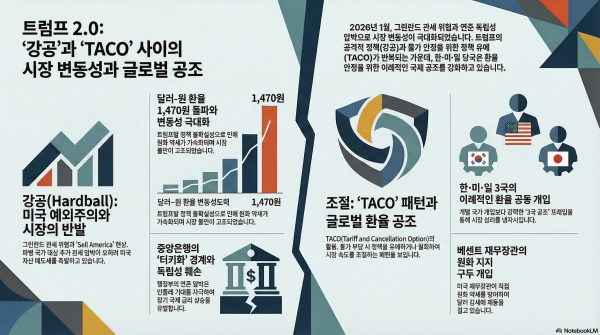 2026 1, 그린란드 매입 갈등에 따른 파병 국가 추가 관세 위협과 차기 연준 의장 인선을 둘러싼 노이즈로 금융 시장의 변동성이 극에 달하고 있습니다. 트럼프의 예측 불가능한 강공책과 물가 안정을 위한 정책 번복(TACO)이 교차하는 가운데, ··일 당국은 환율 급등을 막기 위한 이례적인 국제 공조의 신호를 보내고 있습니다.
