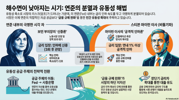 • '금융감독 담당' 보먼의 역할: 보먼 부의장이 규제 완화에 목소리를 높이는 것은 연준발 유동성 흡수를 민간의 대출 확대로 상쇄하기 위한 밑작업일 가능성이 큽니다.