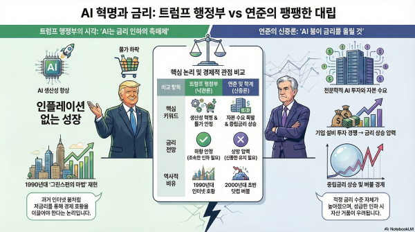 이번 논쟁의 핵심은 'AI라는 신기술이 거시 경제의 자금 수요와 공급 밸런스에 어떤 영향을 미치는가'에 있습니다. 트럼프 행정부는 신기술이 창출할 '비용 절감(물가 안정)'의 마법에 집중하지만, 연준은 그 마법을 구현하기 위해 블랙홀처럼 빨려 들어갈 천문학적인 '투자 자금(자본 수요)'을 경계하고 있습니다.